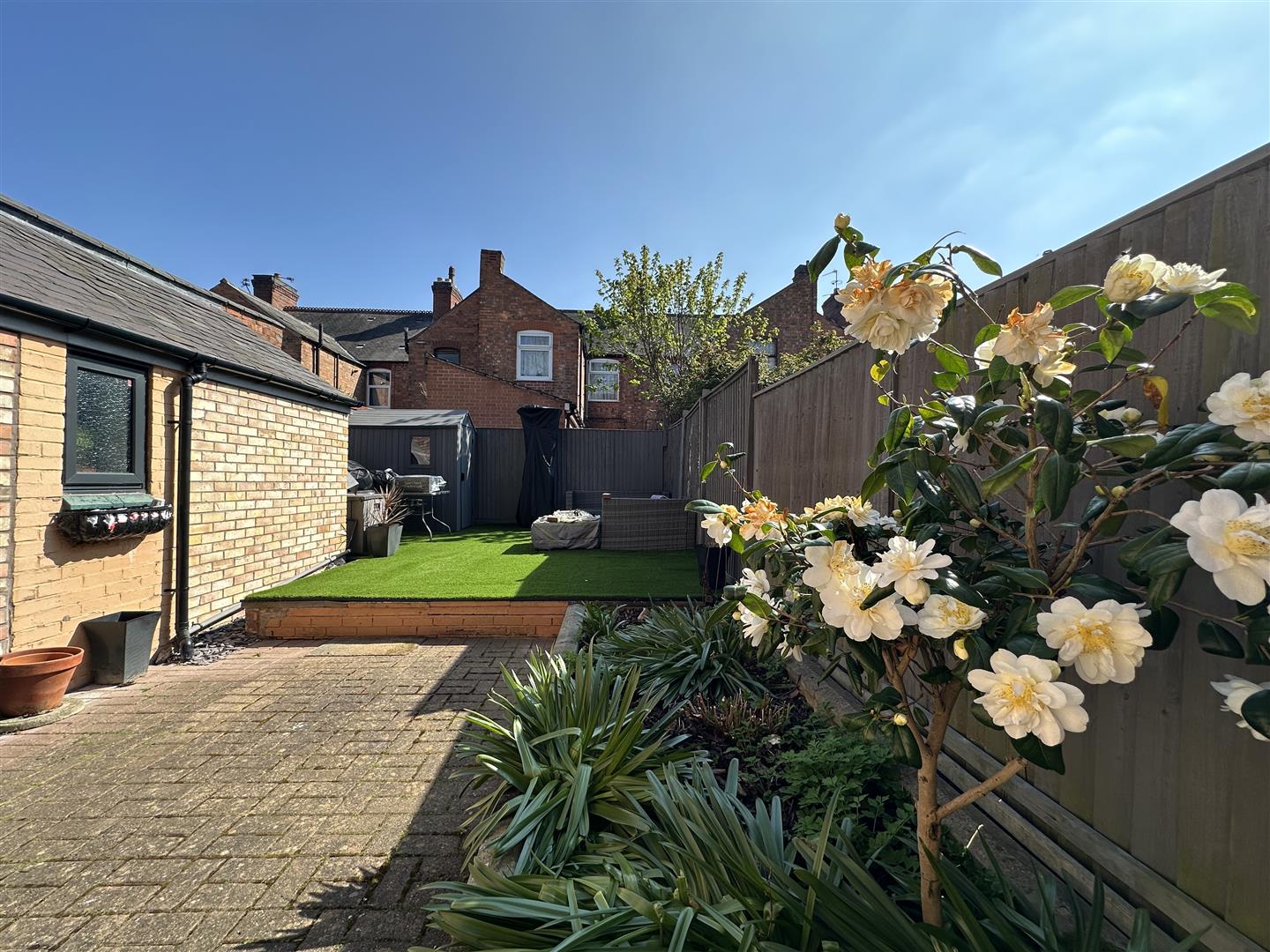 Outside, the property enjoys a walled front garden with steps to the entrance and a private rear garden complete with a patio, AstroTurf lawn, shed, and established borders — ideal for low-maintenance outdoor living.