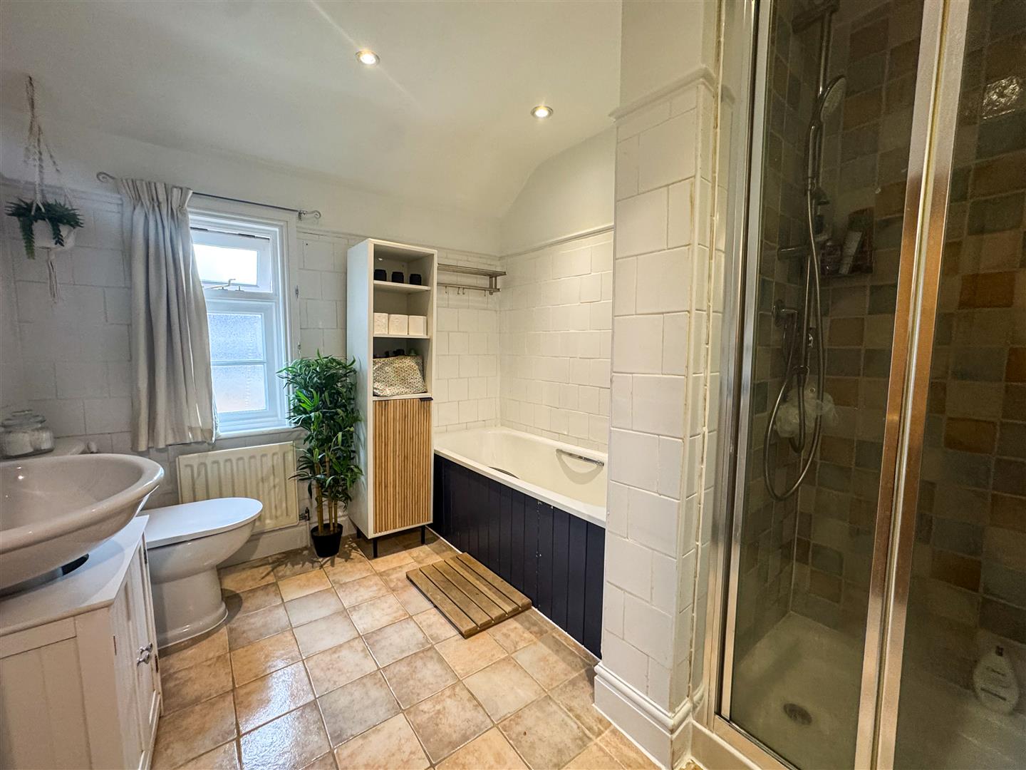Upstairs, you’ll find two excellent double bedrooms — both well-proportioned and inviting. The current owner uses the rear bedroom as the main room, enjoying the peaceful garden view, but either would make a lovely master depending on your preference. The bathroom is particularly impressive, larger than expected and fitted with a modern four-piece suite including a bath, separate shower cubicle, WC, and heated towel rail, all complemented by stylish wall and floor tiling.