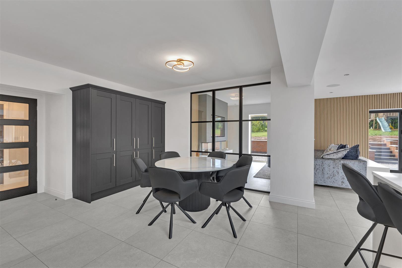 At the centre of this home is the show-stopping open plan living kitchen — a truly elevated space for modern family life. Granite worktops wrap the vast central island, complemented by a premium appliances including Bosch ovens, full-height fridge freezer, induction hob, wine cooler, built-in pantry and Quooker-style tap. The kitchen also features a built-in bar and Critall-style feature wall into the dining area, There a a thoughtfully designed snug area with a stunning feature media wall & fire, Sonos speakers seamlessly integrated. Huge bi-fold doors span the rear, drawing the garden in and bathing the space in natural light. Underfloor heating has been sensitively installed across the new kitchen zone.