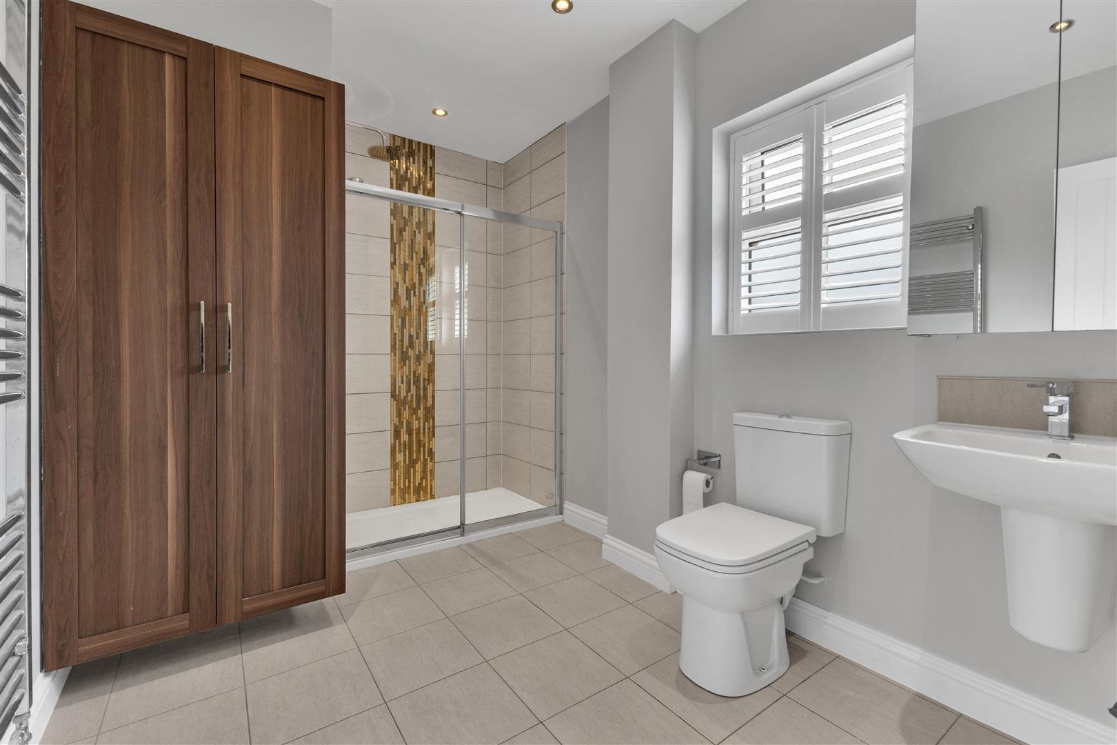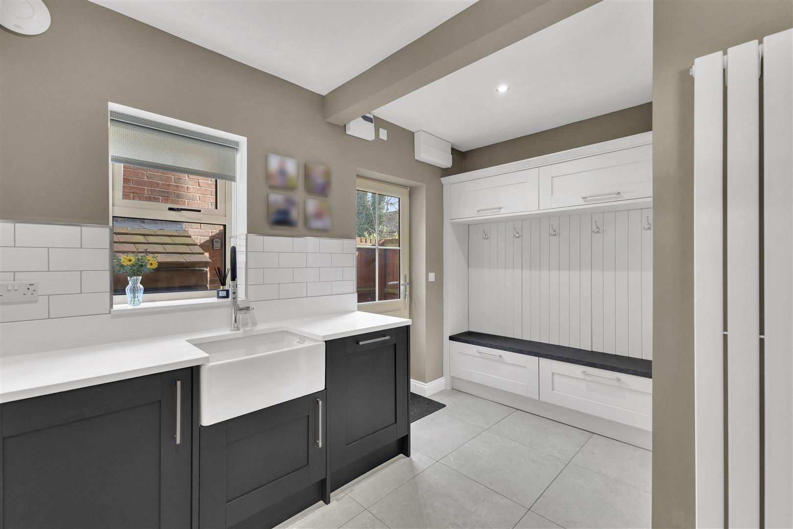 Practicality is woven into every detail: a boot room with built-in storage, Belfast sink and bench; built-in understairs storage; and stylish shutters throughout.