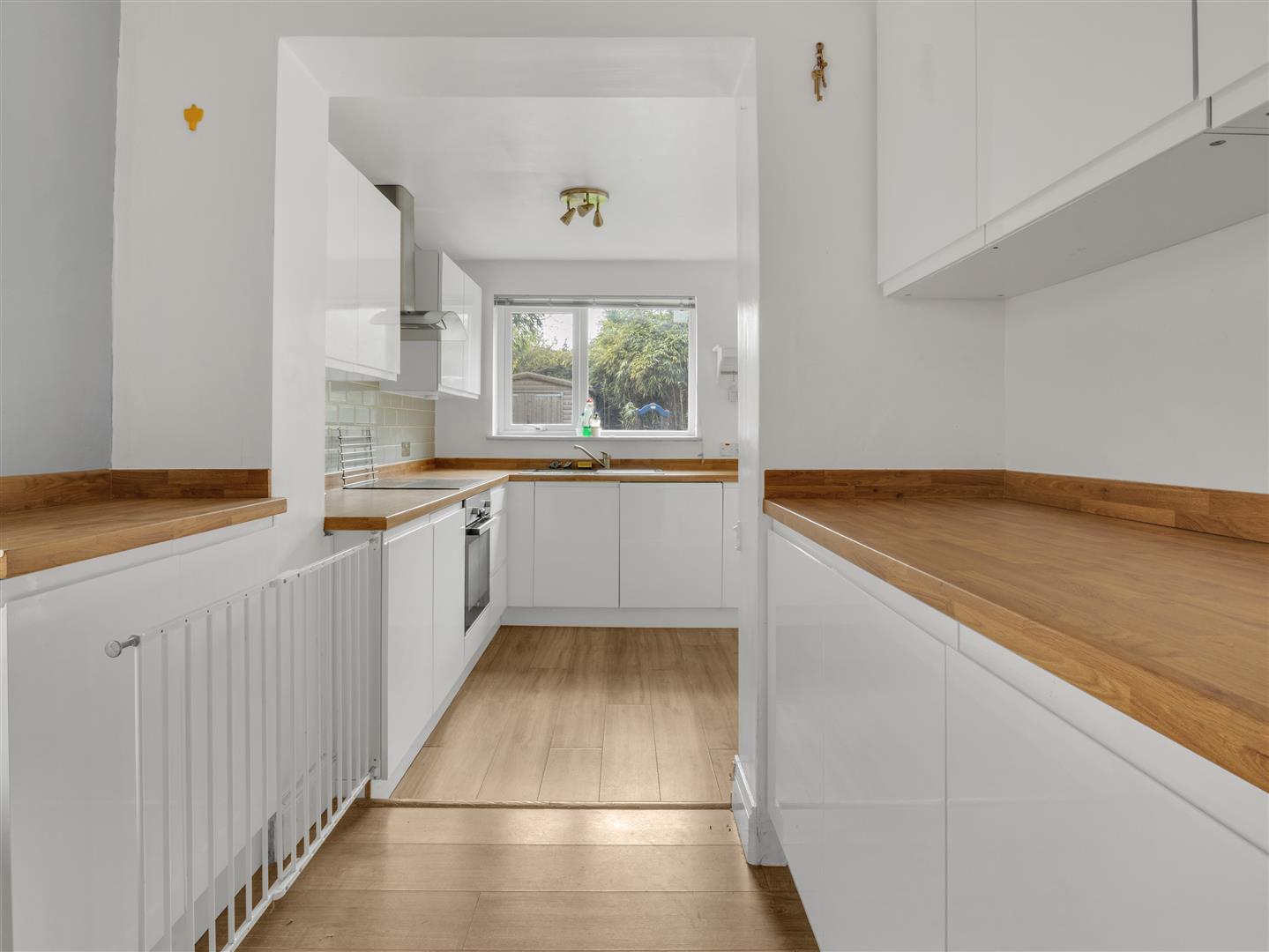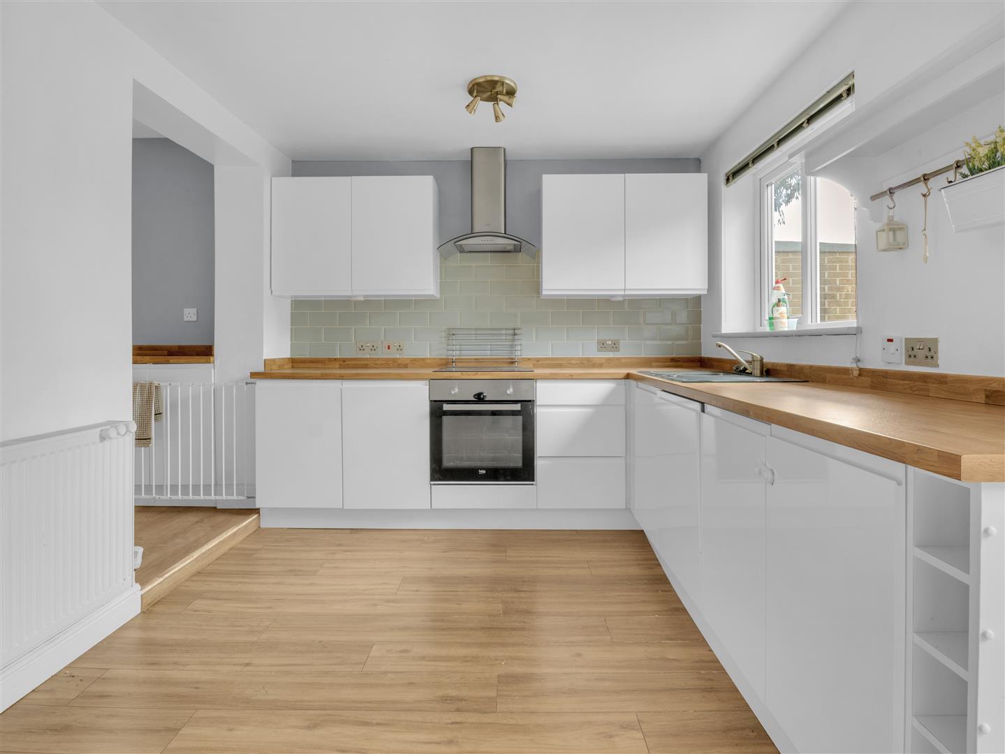 The kitchen is well presented and fitted with a range of eye and base level units, complemented by timber-effect work surfaces and matching upstands. There’s a sink with mixer tap, ceramic tiling, a Beko single oven with four-ring gas hob, and an integrated Hotpoint dishwasher.
