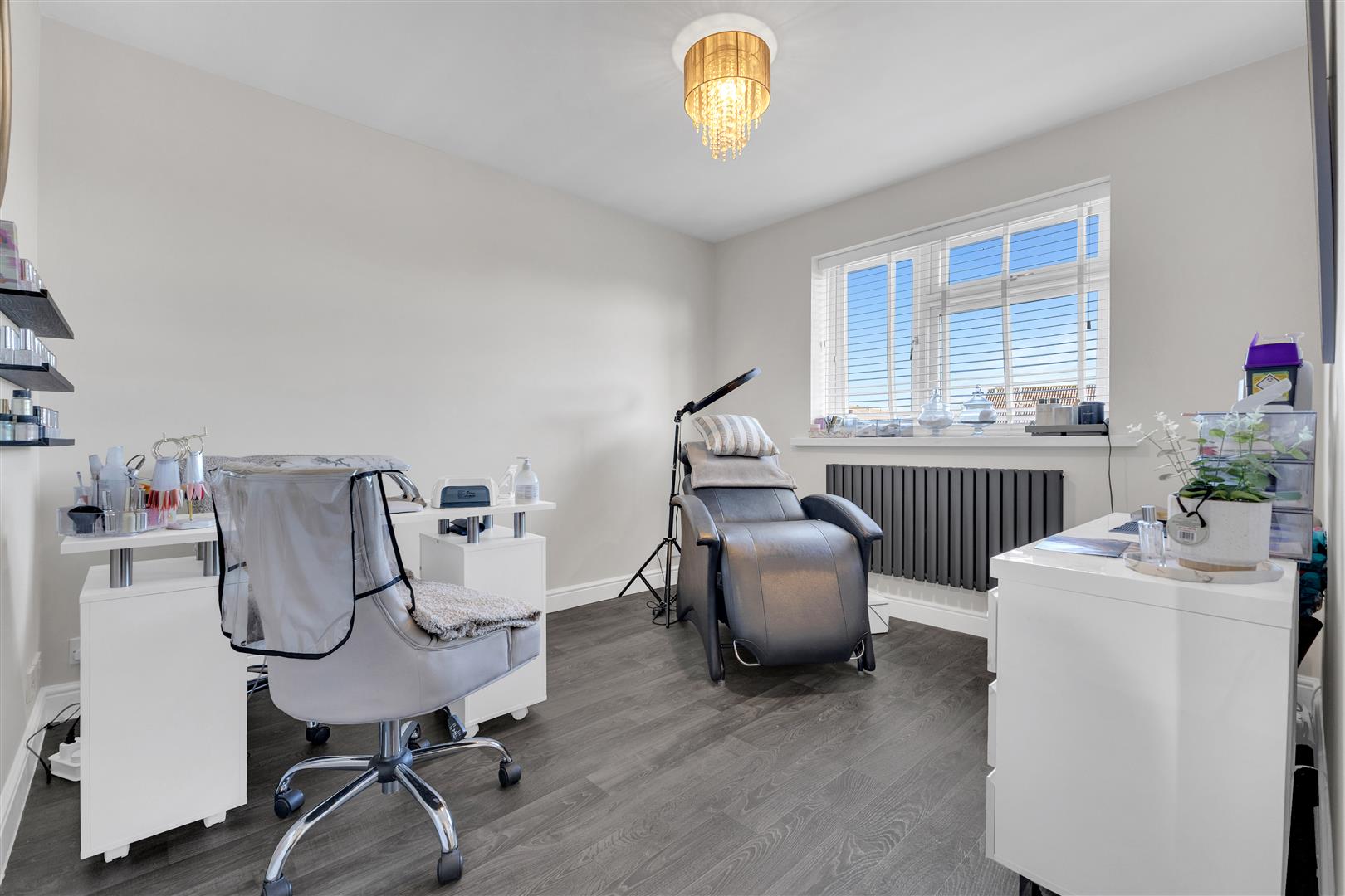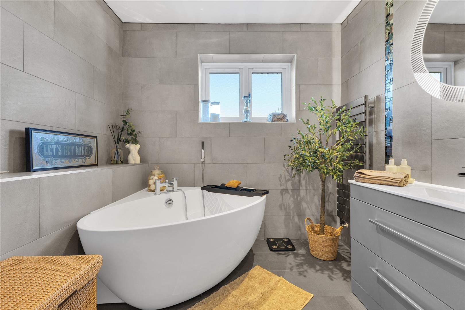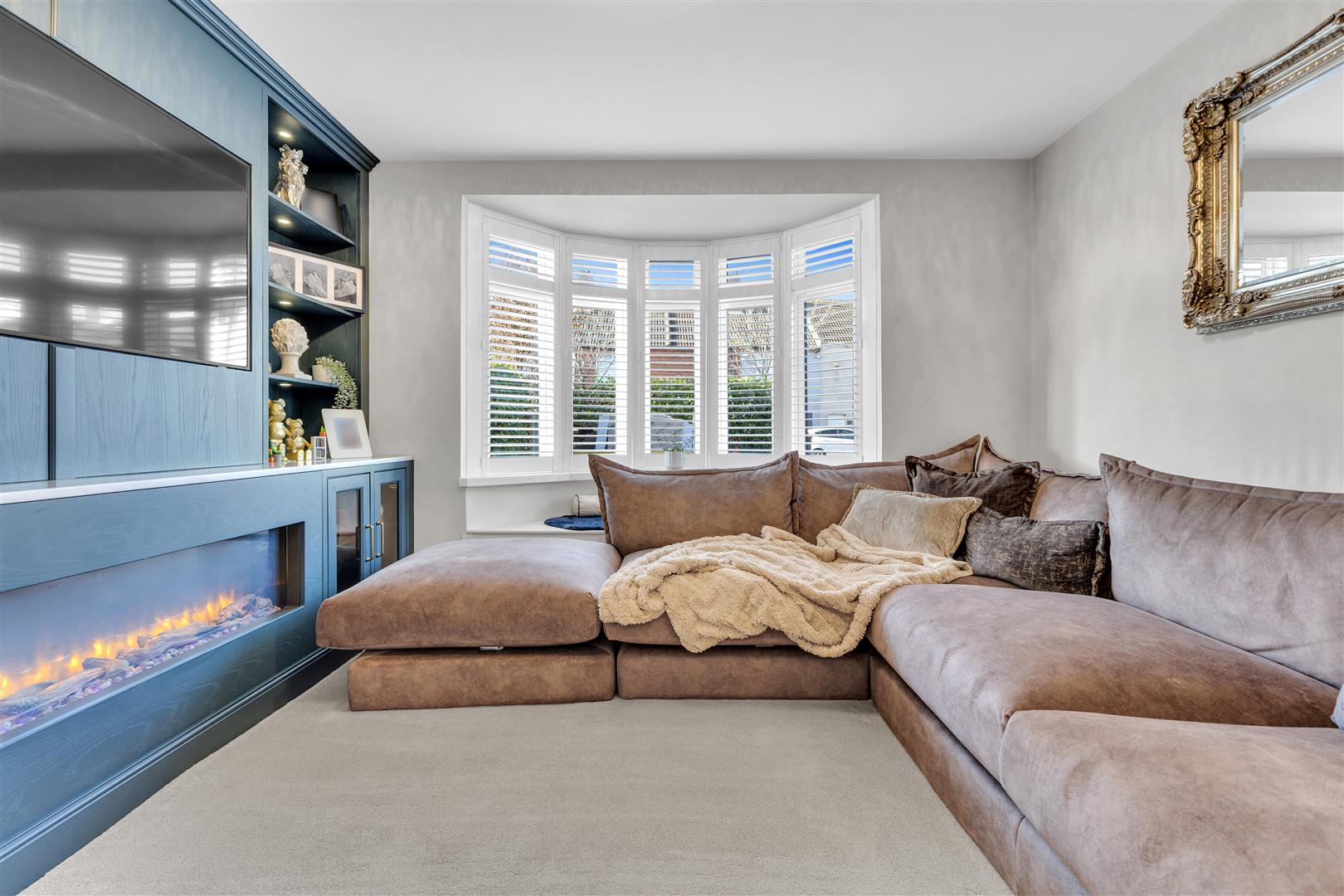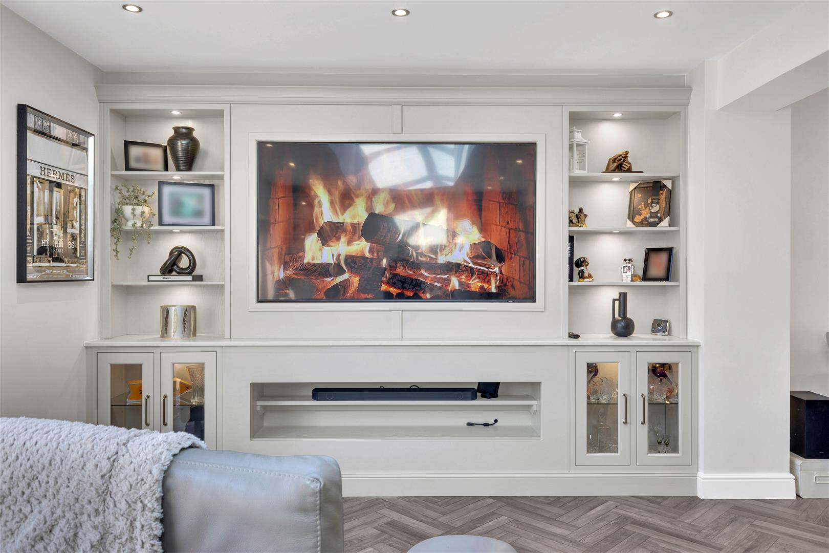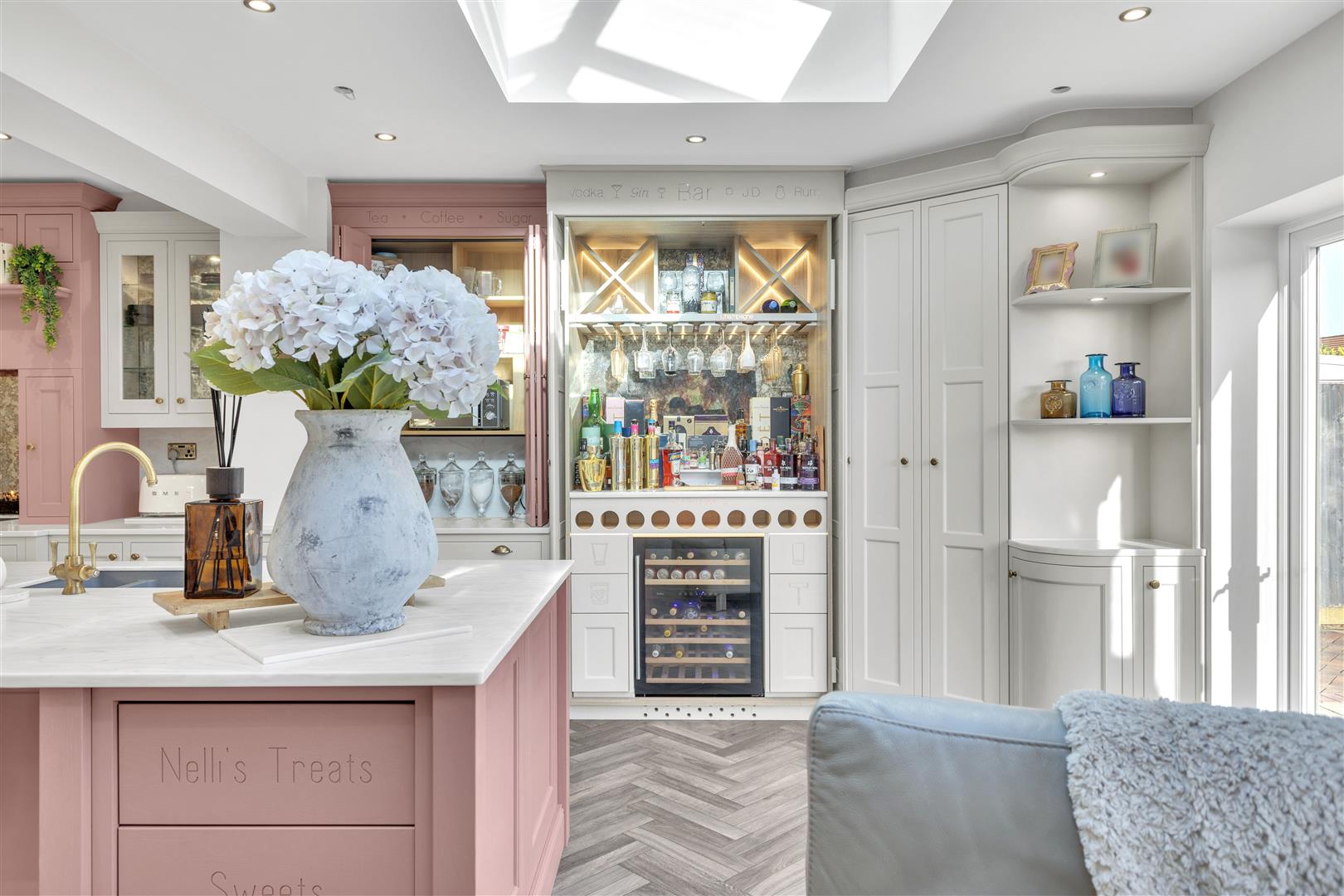The ground floor flows beautifully, beginning with a sophisticated living room featuring a striking media wall that creates an inviting focal point. The heart of this home is undoubtedly the spectacular living kitchen, crowned with an orangery roof that floods the space with natural light. Bi-fold doors seamlessly connect indoor and outdoor living, whilst the bespoke Kingswood kitchen commands attention with its expansive island, integrated barrister drinks station, and cleverly concealed bar - perfect for entertaining. Underfloor heating and a second media wall add both comfort and contemporary style.