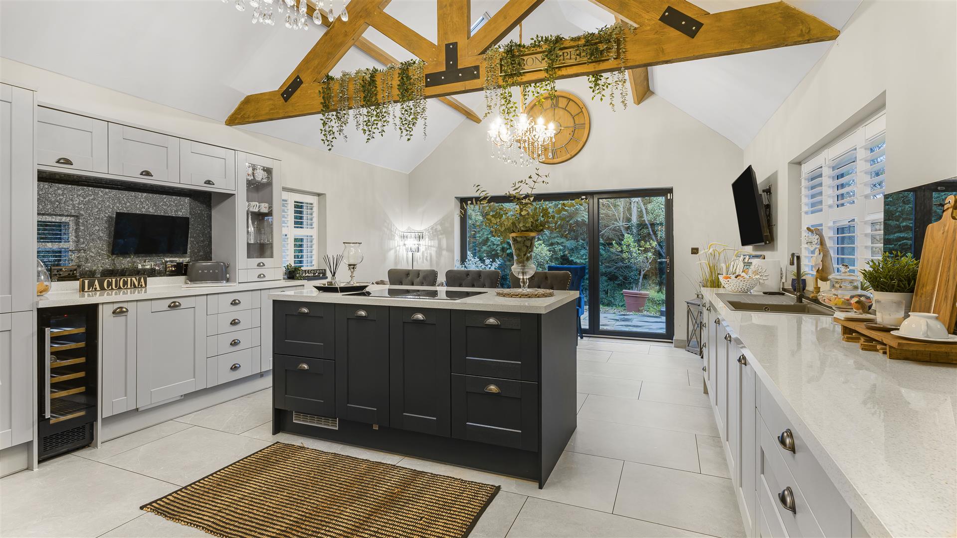 The main residence has been renovated and extended to an exceptional standard, achieving true show home quality throughout. Spanning over 3,300 sq ft, it offers a stunning vaulted open-plan living kitchen — a light-filled heart of the home designed for both family life and entertaining. Three further elegant reception rooms provide flexibility and flow, while four luxurious double bedrooms and four designer bathrooms offer hotel-level comfort and timeless style.