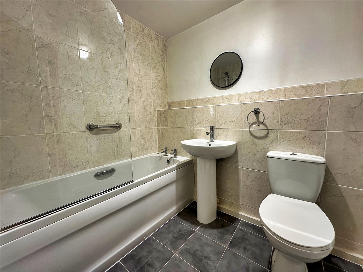 The master bedroom is a generous size and includes fitted wardrobes, providing excellent storage solutions. It also benefits from a private ensuite, which is fitted with a large double shower cubicle, wash hand basin, and WC, ensuring convenience and privacy. The second bedroom is another well-proportioned double room, featuring its own bay window that enhances the natural light in the space. Completing the interior is the family bathroom, which includes a white suite comprising a bath with a shower overhead, a wash basin, and a WC, all finished to a high standard.